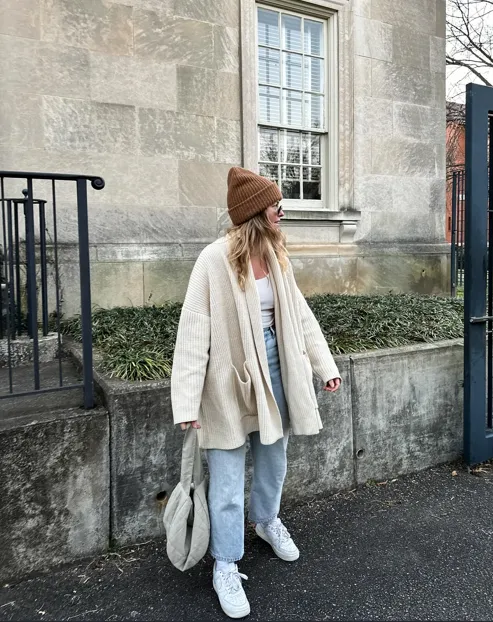 The cardigan adds warmth, coziness, and a relaxed, inviting vibe.