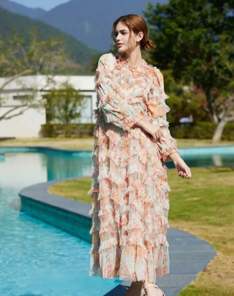 A long-sleeved maxi silhouette provides coverage and elegance.