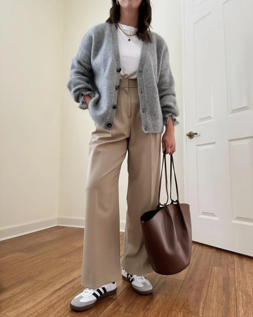The key to making it look stylish instead of boring is to play with textures think a cotton tee, leather-look leggings, and a wool-blend cardigan.