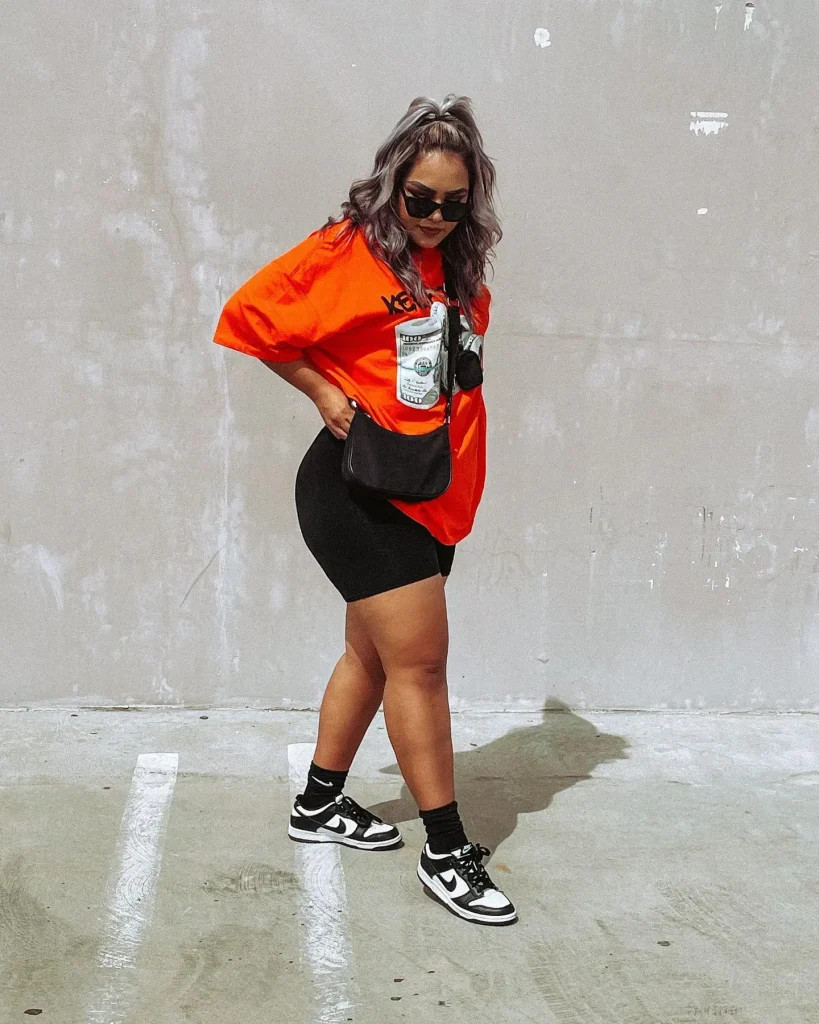 For a sportier, trend-forward vibe, the biker shorts and oversized sweatshirt combo is a winner.