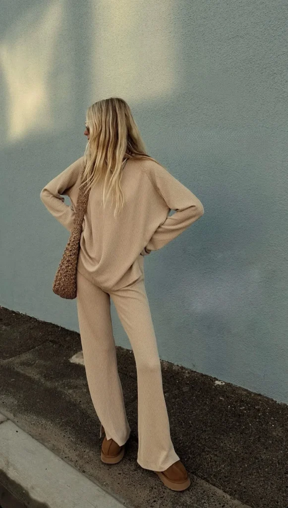 We’re talking about a matching, tailored sweatsuit set in a neutral color like beige, heather gray, or black.