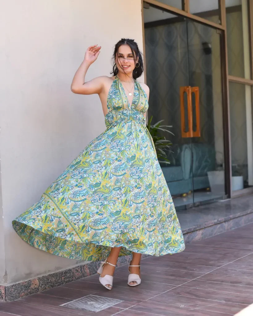 A flowy maxi dress in a muted floral or paisley print is always a good idea, especially for a daytime or backyard housewarming.