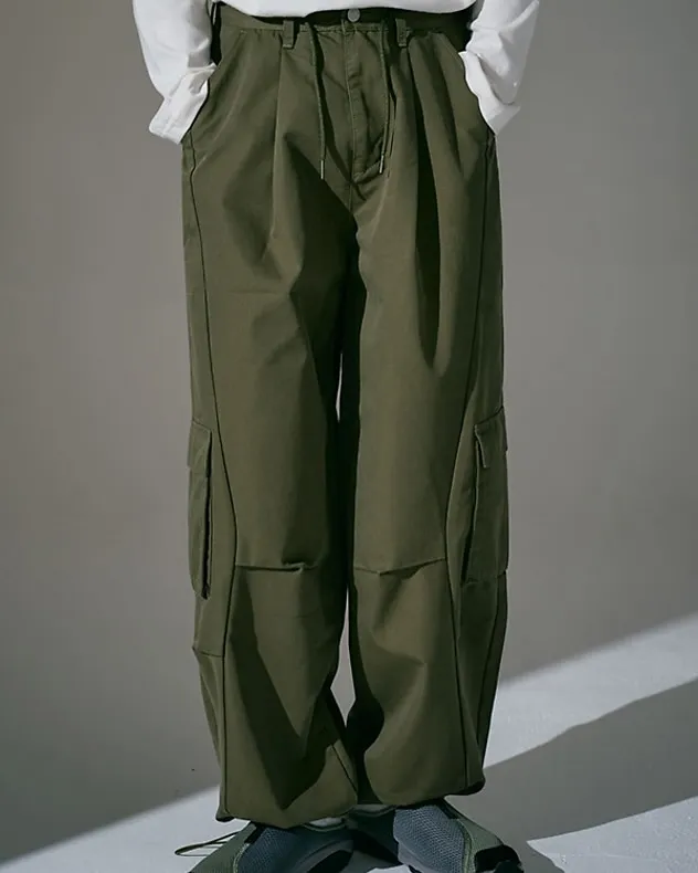 Think tailored cargo pants or trousers in an olive, khaki, or black hue.