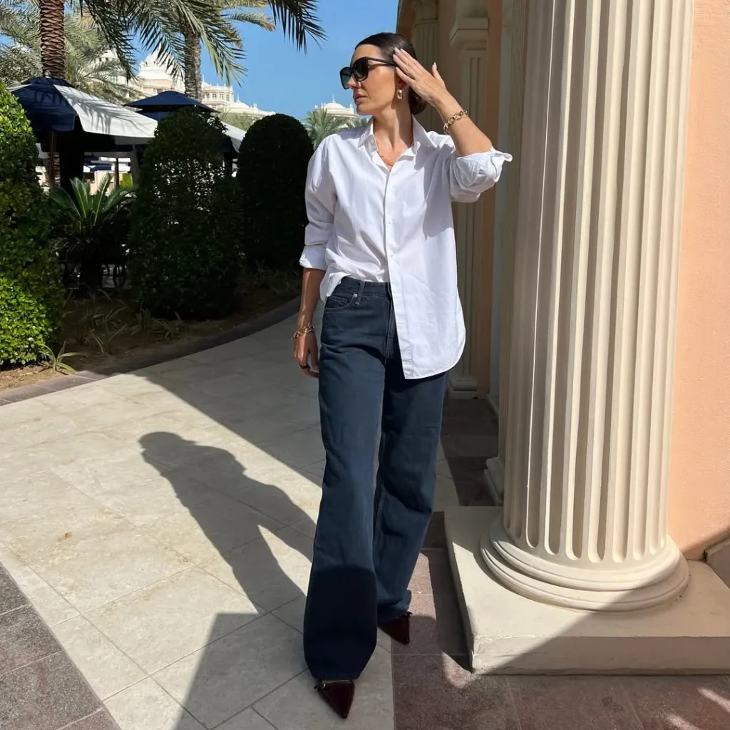 Choose a beautiful, slightly oversized button-down shirt (silk, crisp cotton, or a fun print) and do the “French tuck” just tucking the very front into your jeans, leaving the rest out.