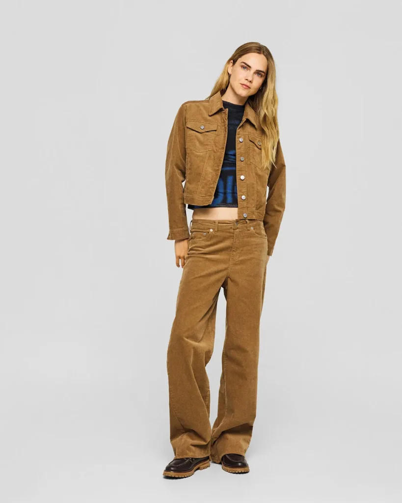 Whether it’s a pair of wide-leg corduroy pants, a skirt, or a jacket, this textured fabric instantly adds warmth and seasonal style.