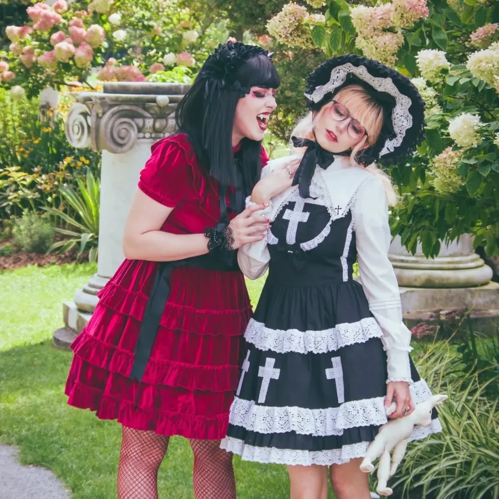 The vampiric twist comes from the details: a dark red lip, maybe some subtle fang-like eyeliner flicks, and a vintage-looking book as a prop.