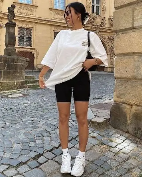 It’s the ultimate blend of comfort and low key chic. The tee keeps you breezy, the bike shorts offer a sporty edge, and together they scream “I’m too cool to care, but secretly I do.