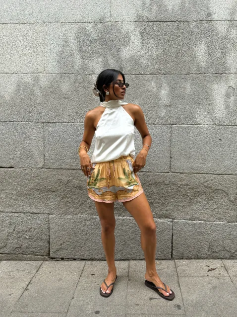 3. Silk Scarf Top & High-Waist Shorts