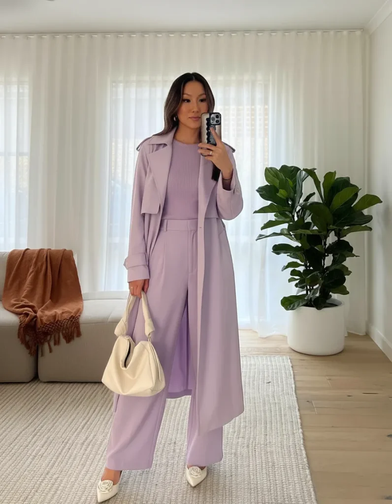Grab a lilac trench coat, pair it with matching wide-leg trousers, and throw on a knit top in the same hue.