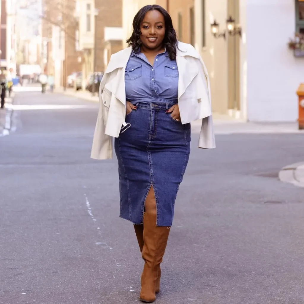 Rock a chambray shirt tucked into a darker wash denim skirt or shorts.