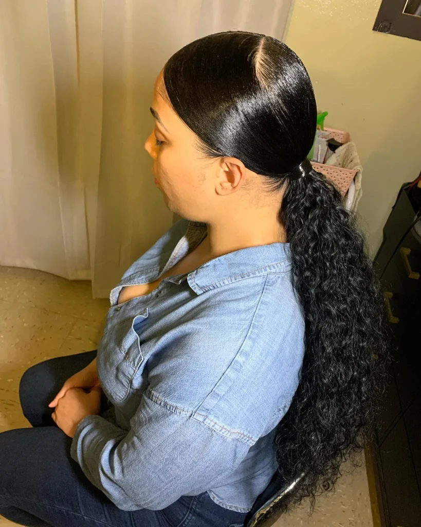 The contrast between the sleek top and the voluminous curly pony is chef’s kiss. This is a sophisticated choice and a great way to manage Big Curly Hair elegantly.