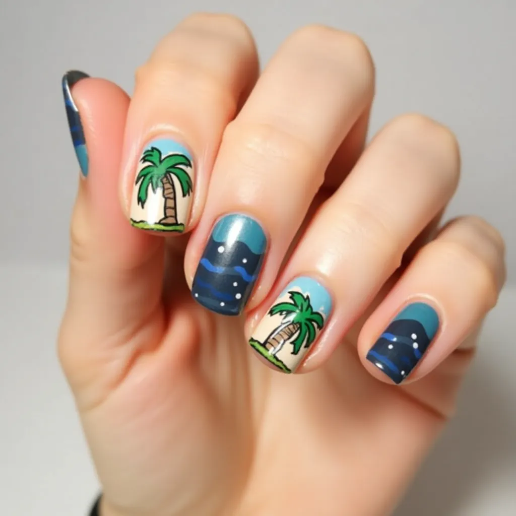 Add tiny palm tree charms or embellishments to your nails for a unique touch.