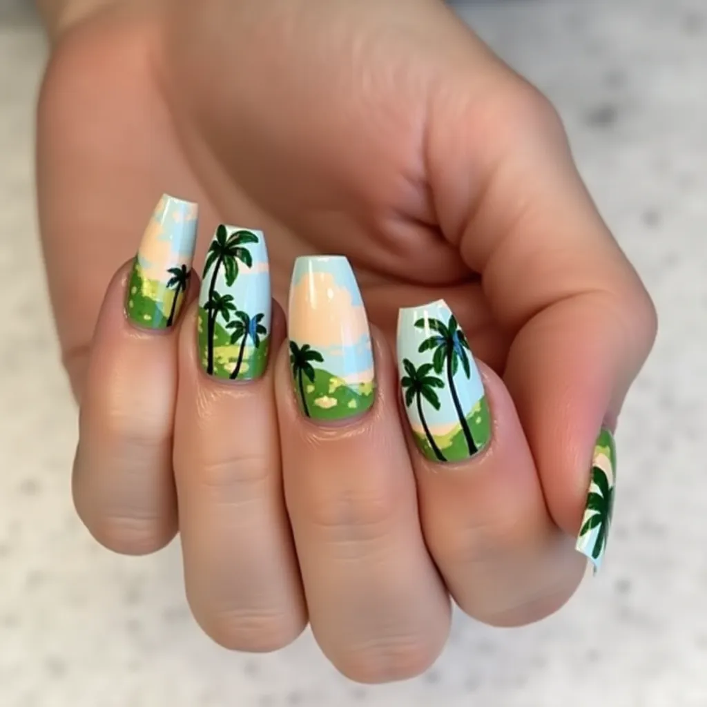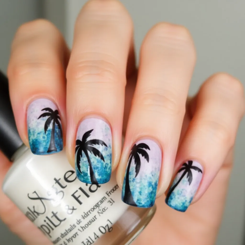 Watercolor palm tree nails give a soft, artistic feel to your tropical manicure.