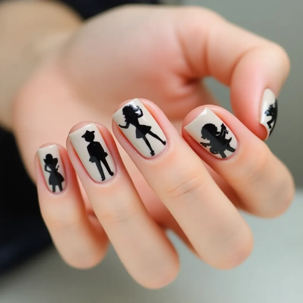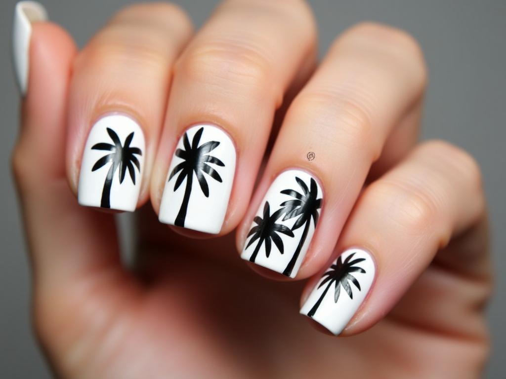 A simple black palm tree silhouette on a beige or nude base creates an elegant and chic look.