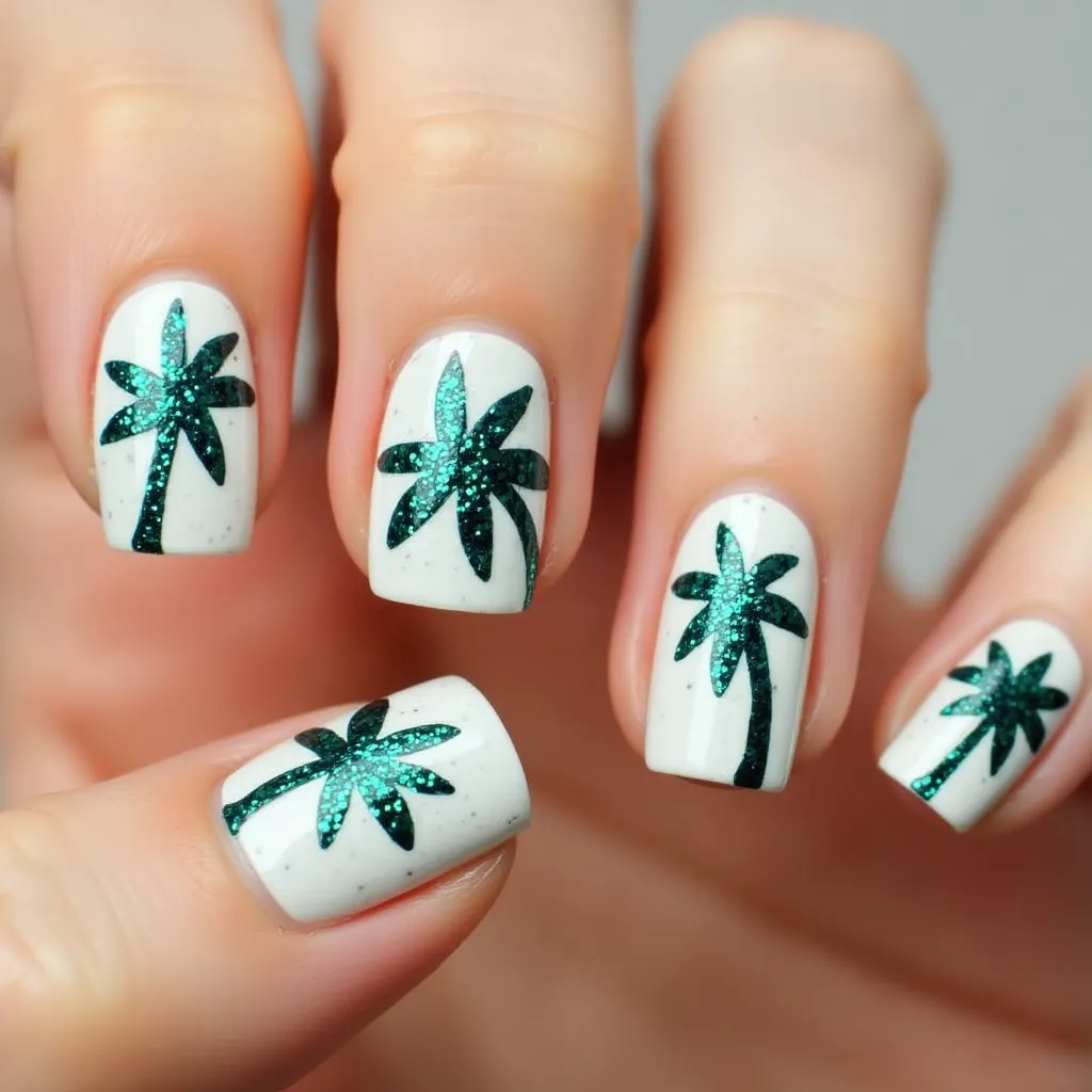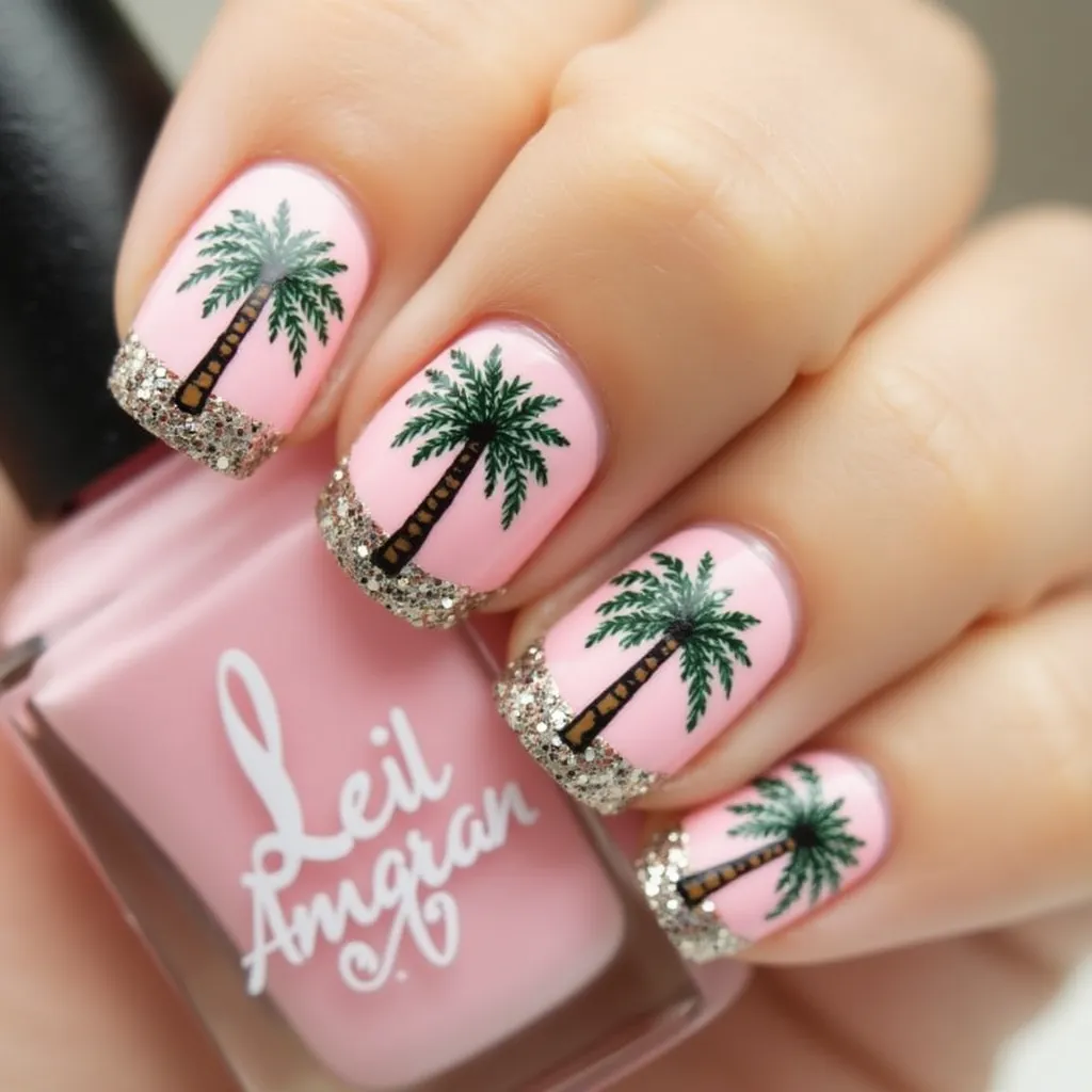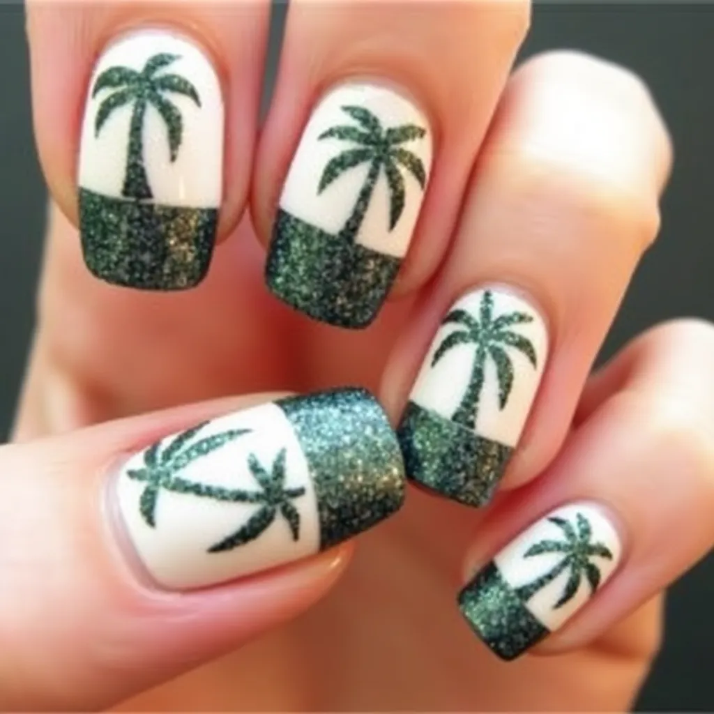 Add a layer of glitter at the tips of your nails, with the palm tree design starting at the base.