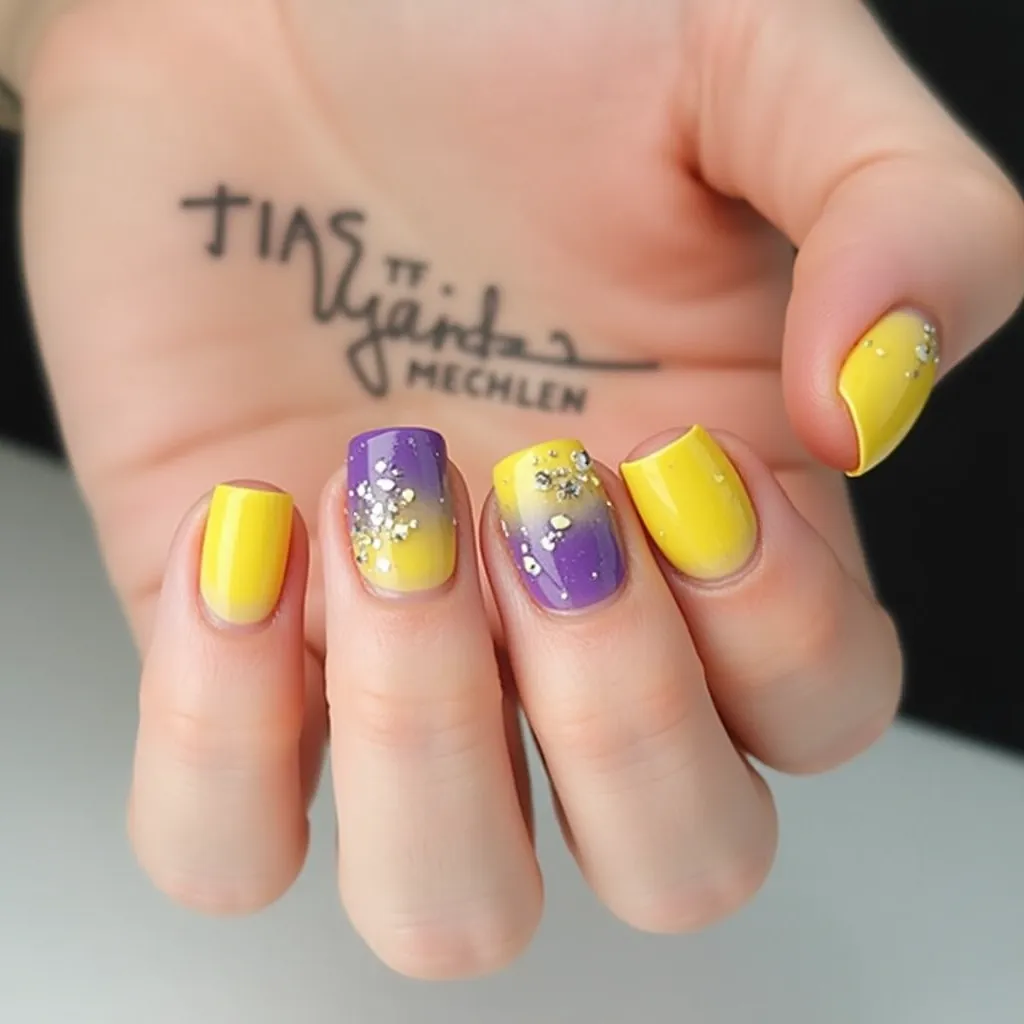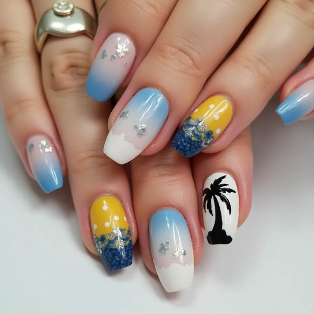 For a bold twist, use yellow and purple for a sunset ombre, then add palm trees at the tips of your nails.