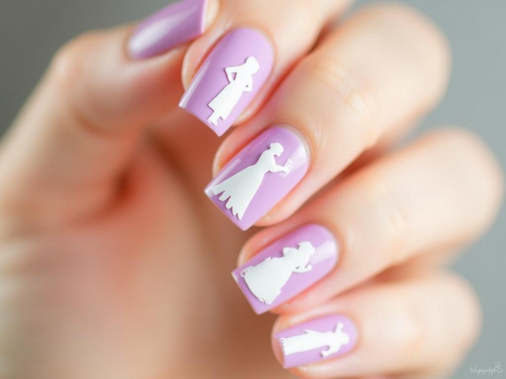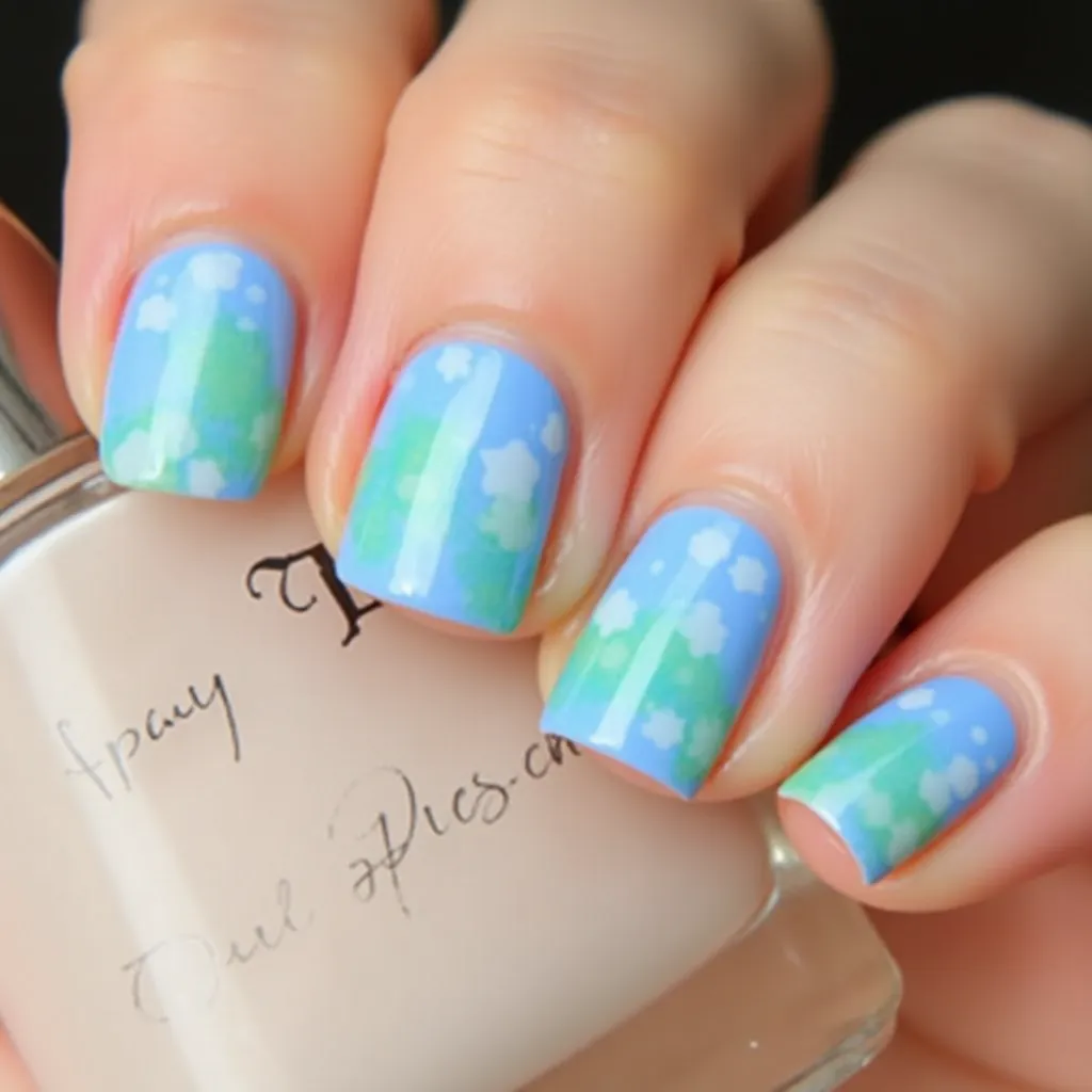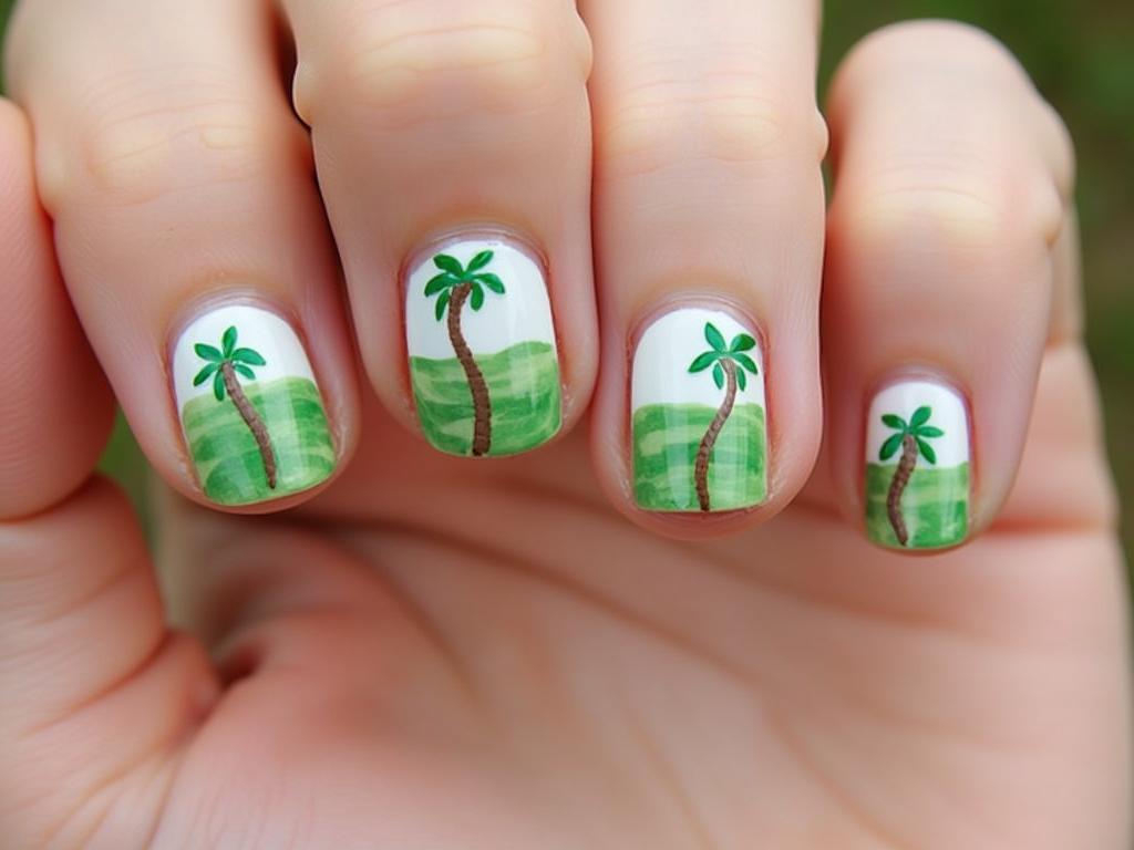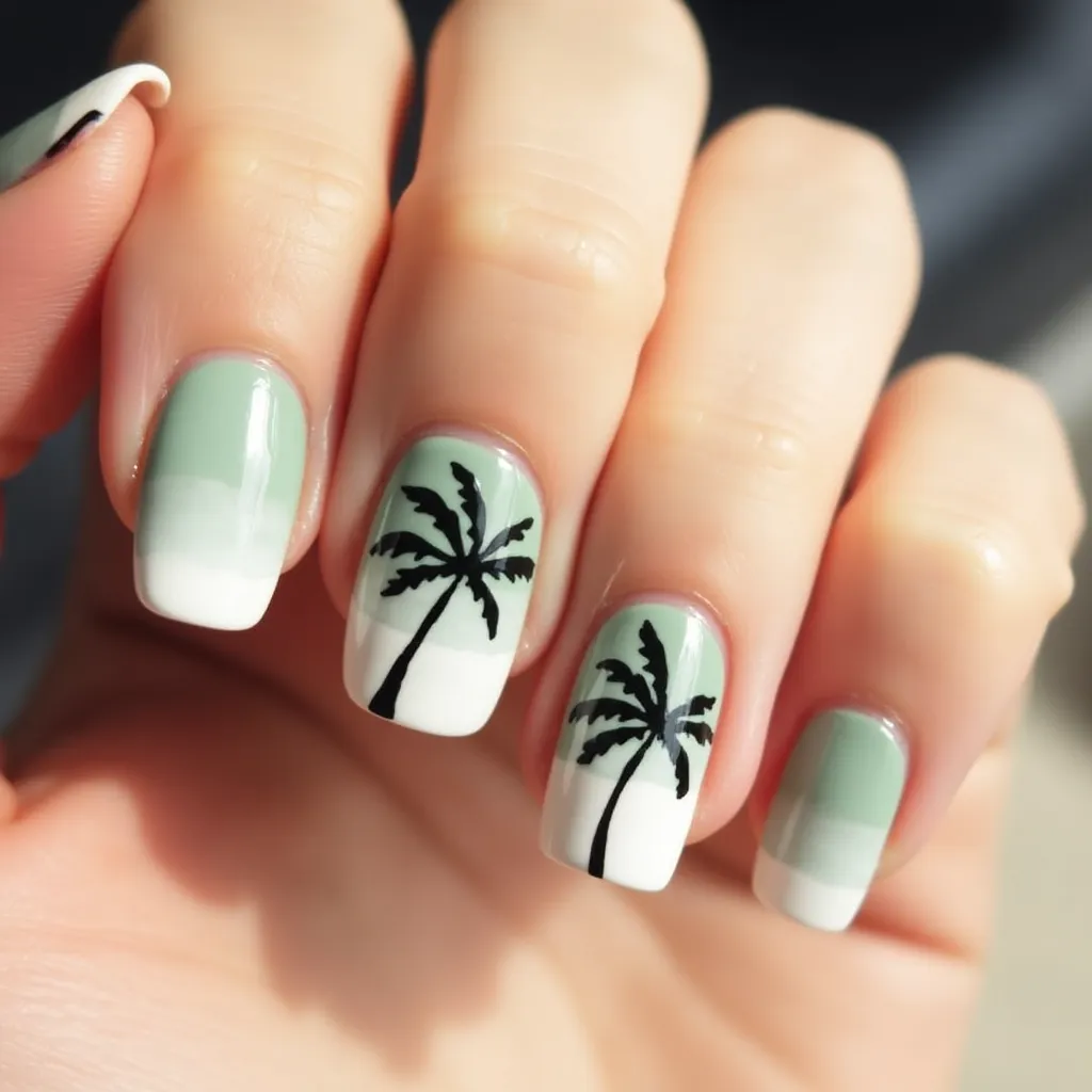 Use white polish to paint delicate palm tree shapes on pastel-colored nails for a soft, dreamy design.