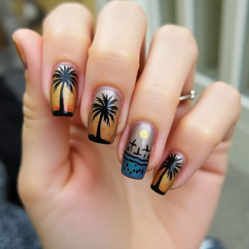 Combine a palm tree design with a small sunset on one accent nail for an eye-catching combination.