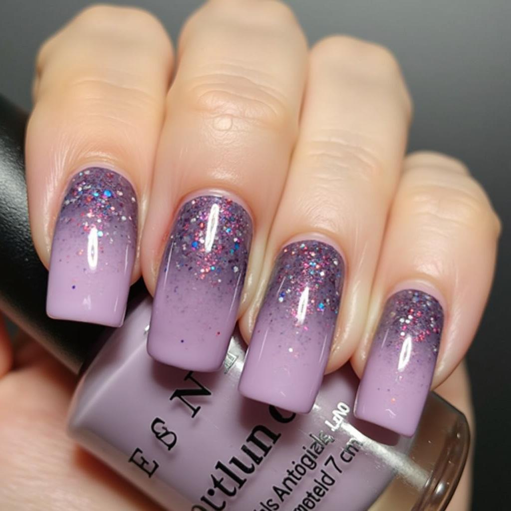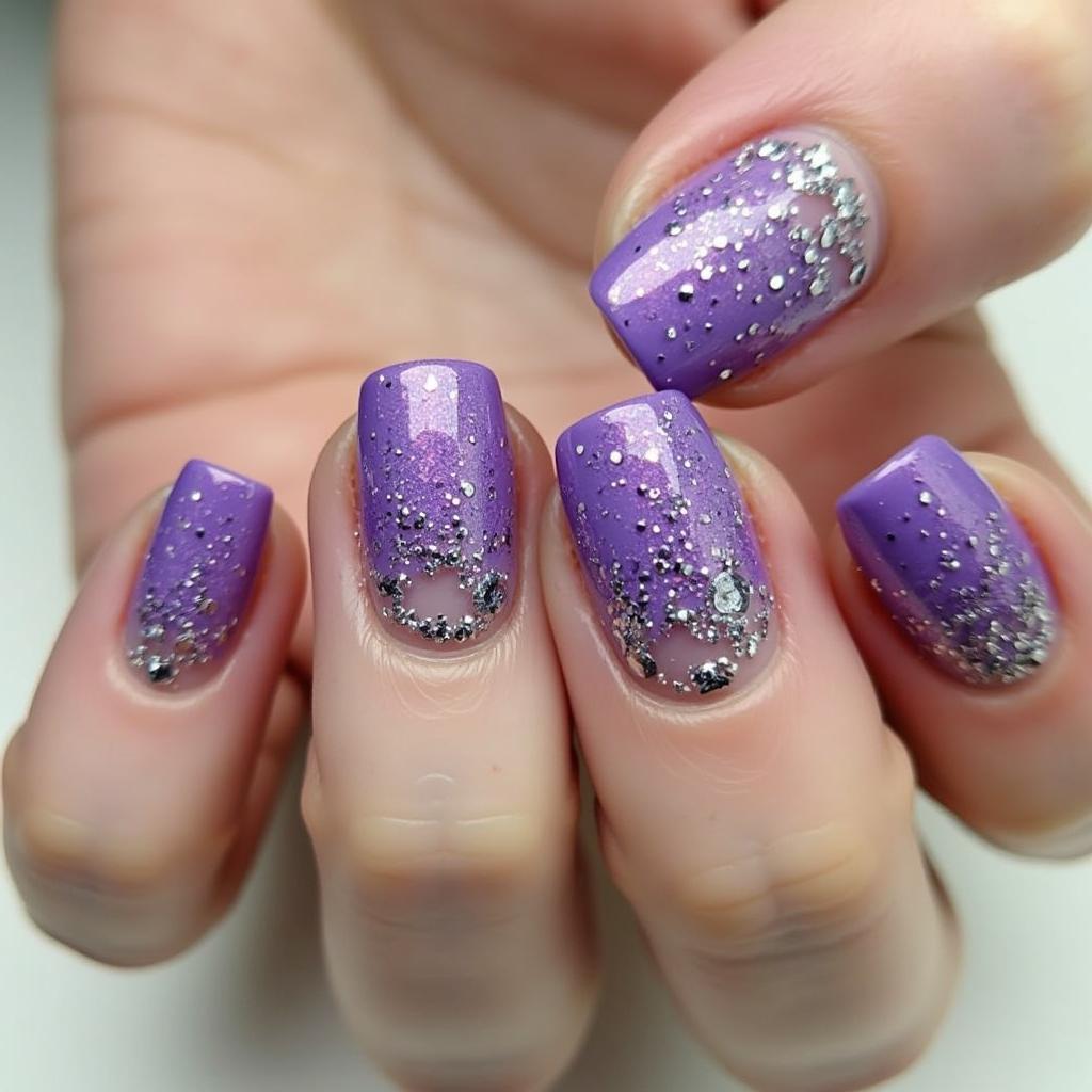 For a softer look, start with light purple glitter near the cuticle and gradually fade it out to clear for a delicate, sparkling finish.