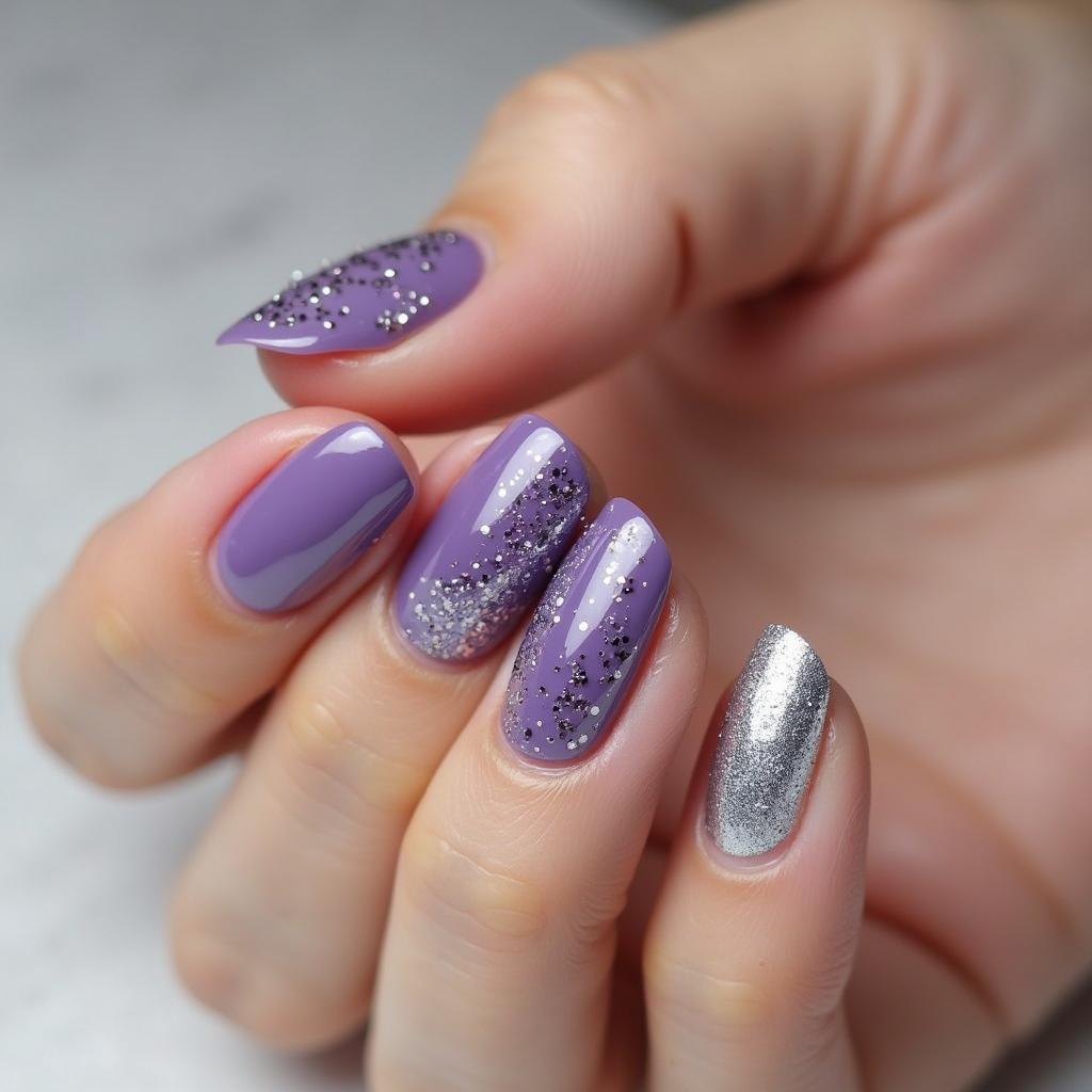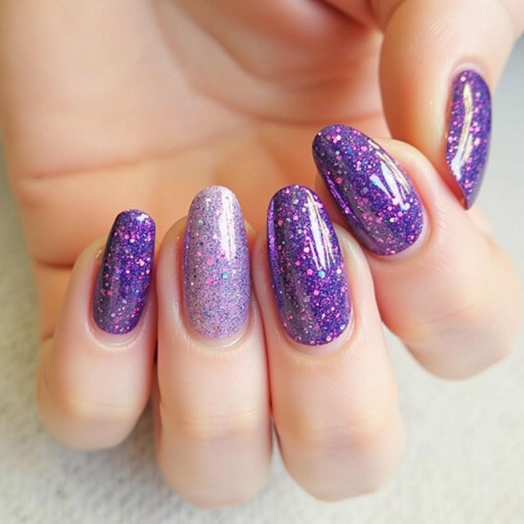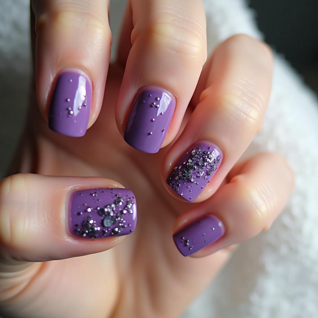 If you prefer a subtle hint of sparkle, try accent nails with purple glitter while keeping the rest of your nails in a neutral or solid color.