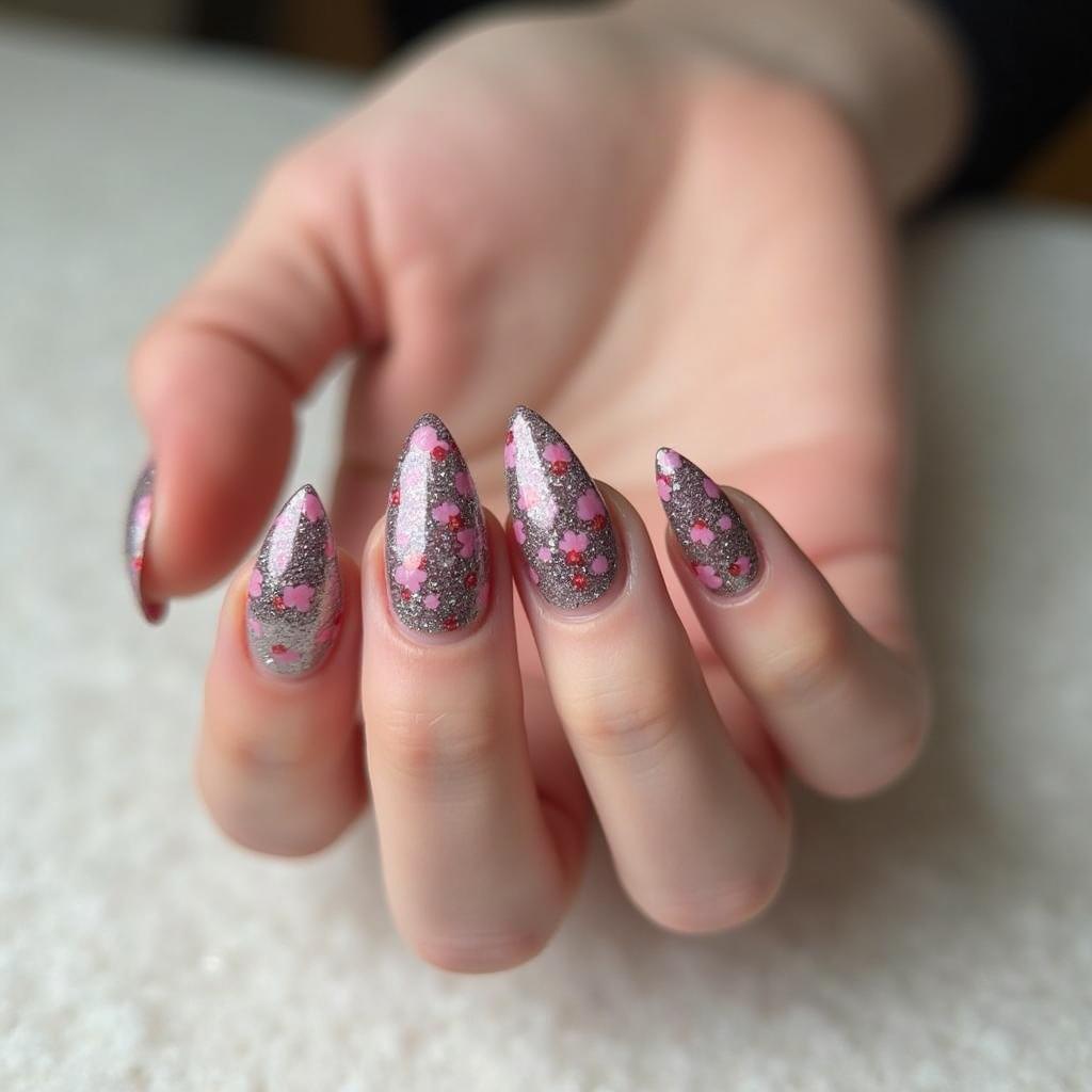 Paint small, delicate purple glitter flowers on your nails for a fun, feminine, and sparkly design.