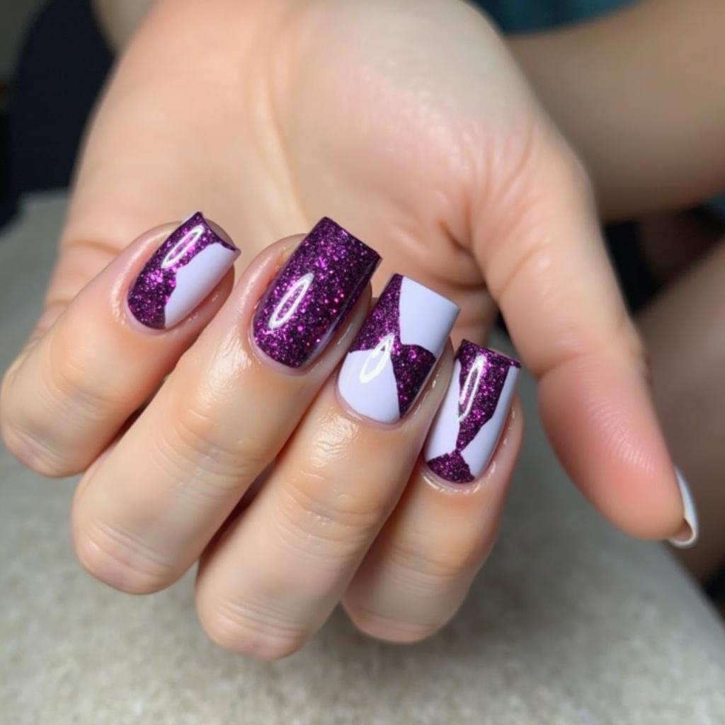 Incorporate negative space geometric patterns, such as triangles or squares, with purple glitter to create a chic, contemporary look.