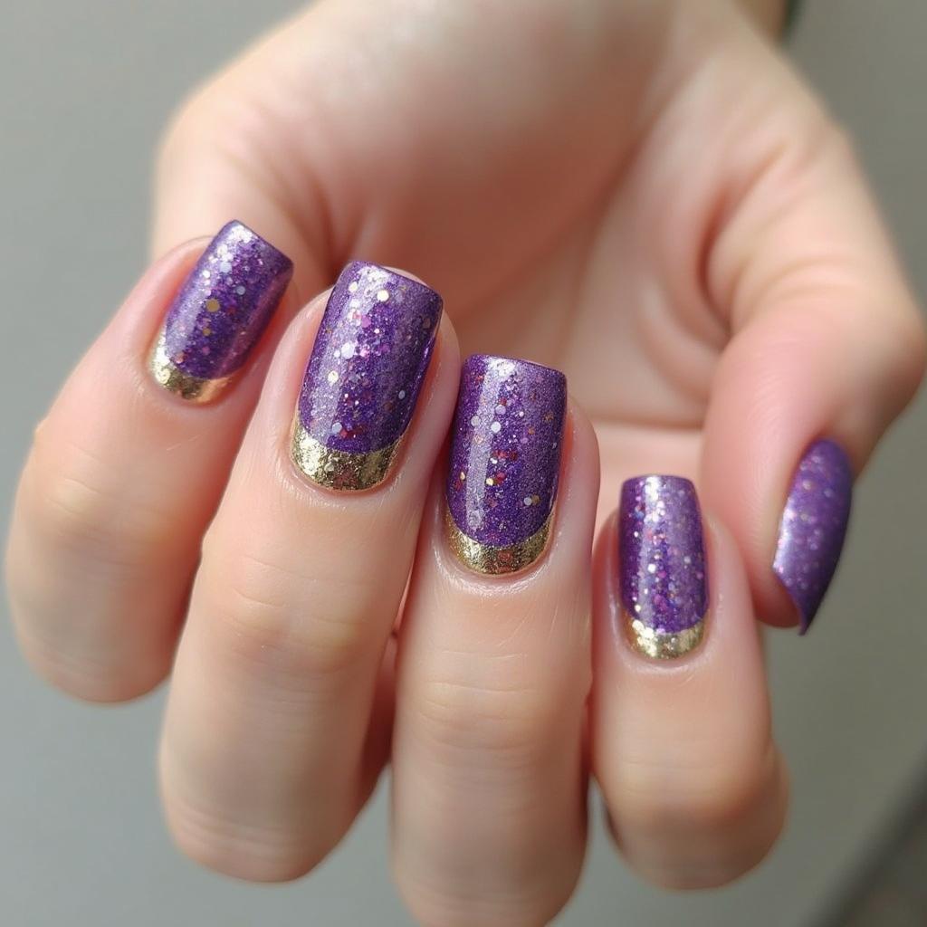 Use small gold accents, like dots or lines, on top of purple glitter nails for a refined and polished design.