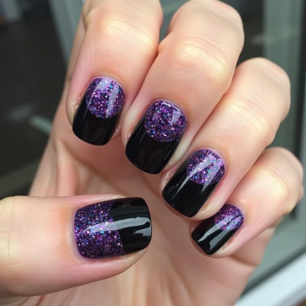 Create a half-and-half design with black on one side of your nails and purple glitter on the other for a bold, dramatic effect.
