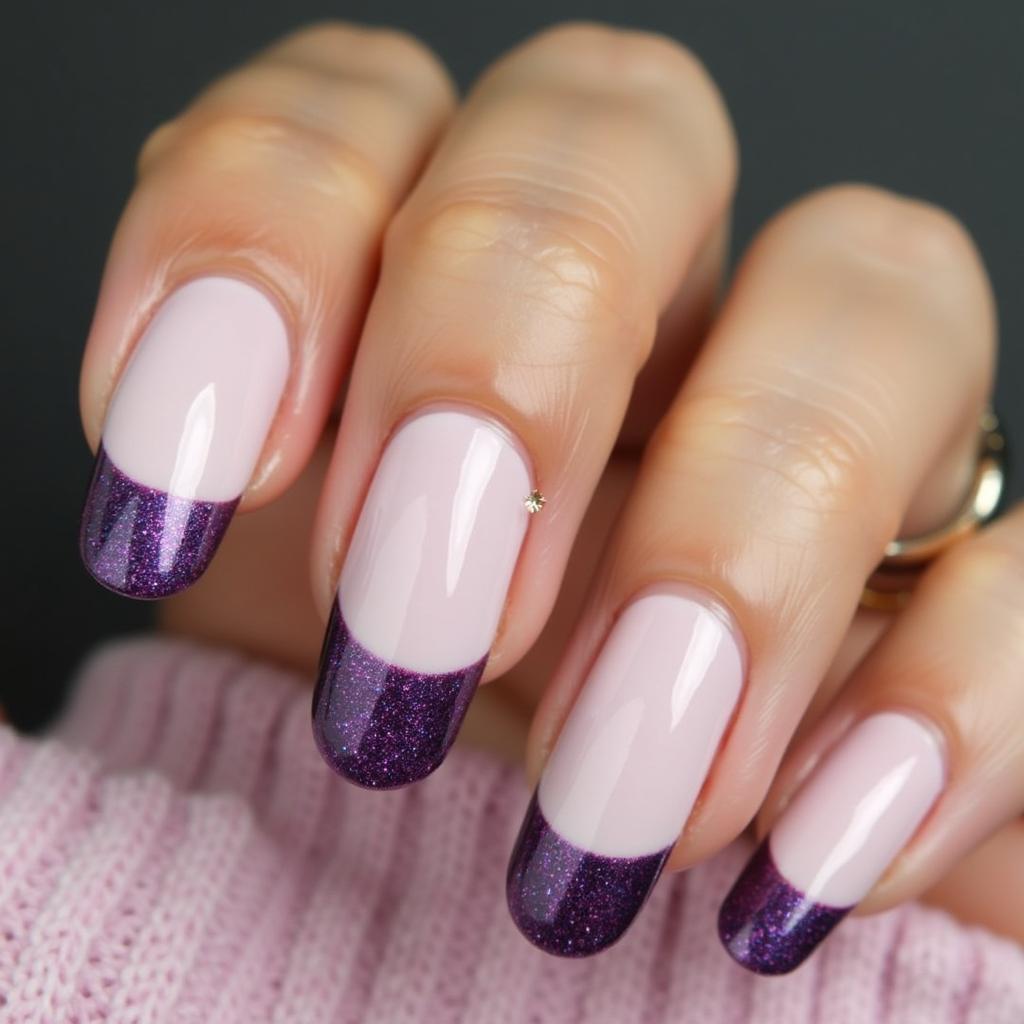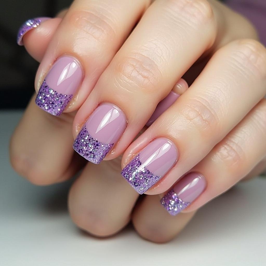 Use purple glitter only on the tips of your nails as a stylish accent, keeping the base color simple and chic.