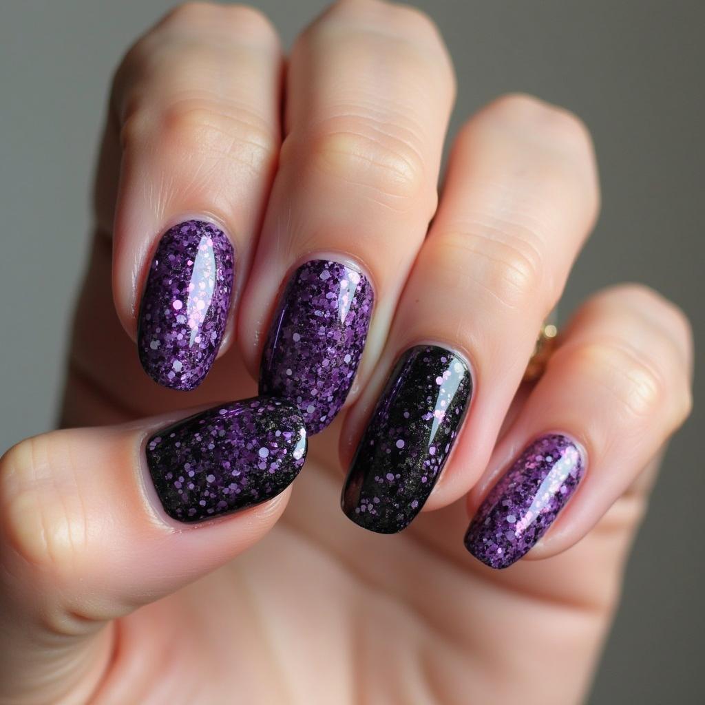 7. Purple Glitter and Black Nails
