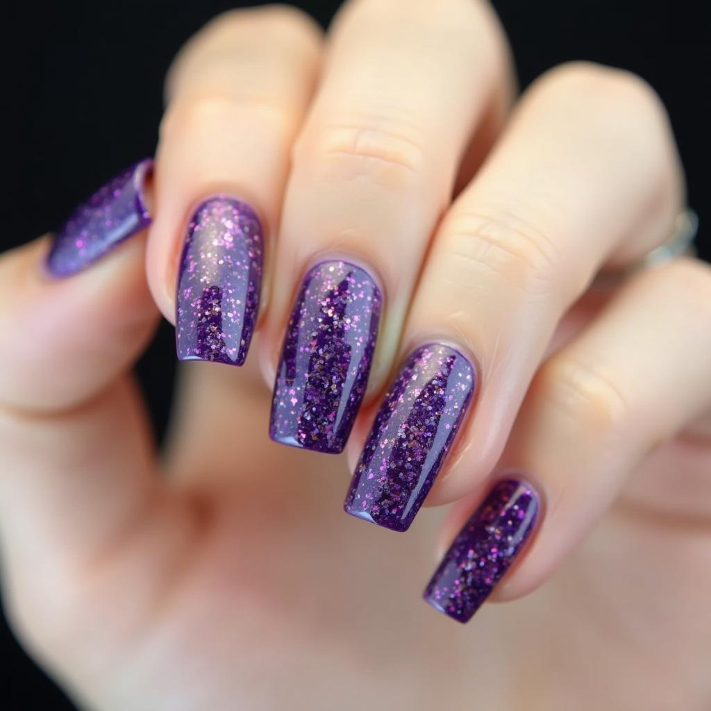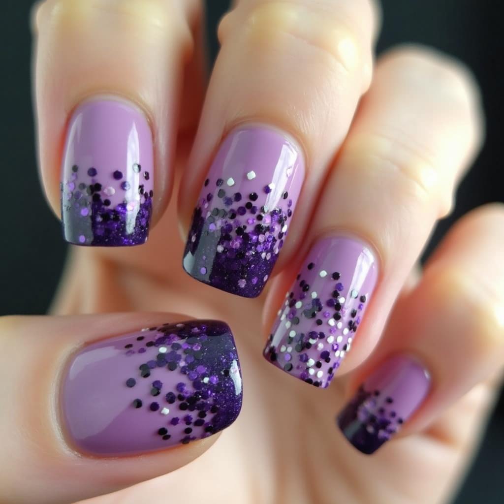Start with a dark purple at the base of your nails and gradually fade it into a lighter purple glitter at the tips. This ombre effect adds depth and dimension.