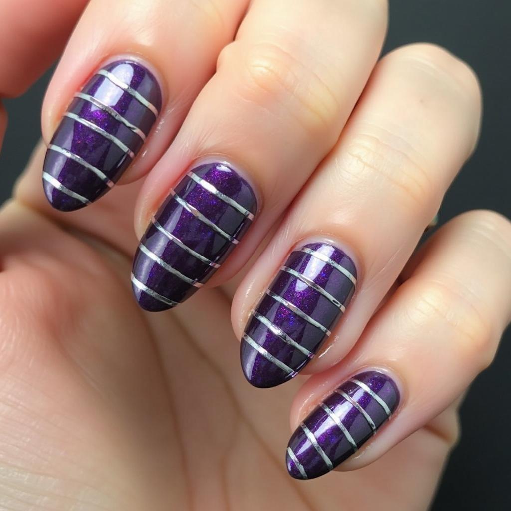 Add thin silver lines or stripes over a purple glitter base for a sleek, elegant design that adds dimension.