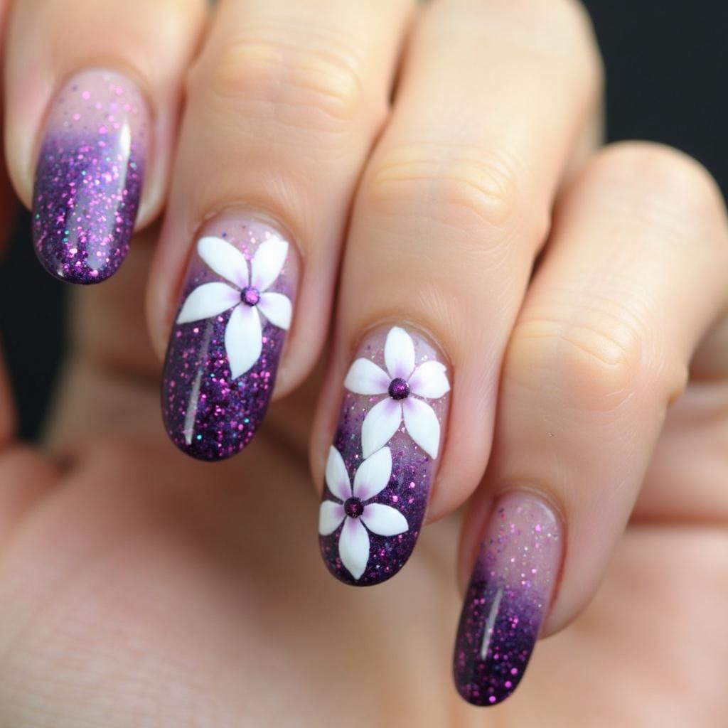 10. Purple Glitter and Floral Nail Art