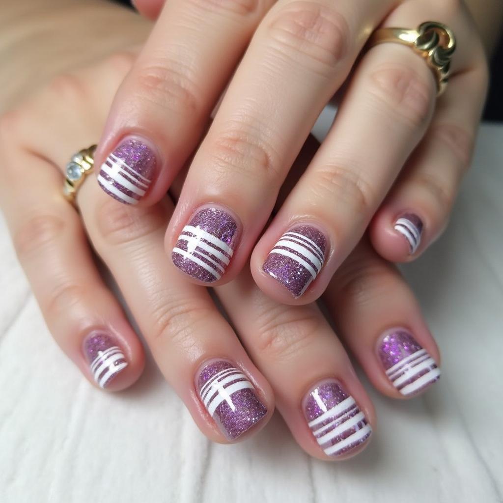 Add thin white stripes over your purple glitter nails for a modern and sophisticated look that blends sparkle with clean lines.