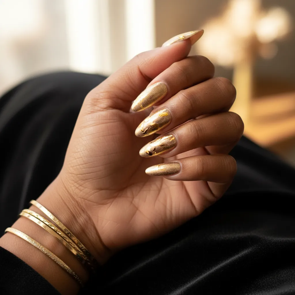 This isn’t a stark metallic gold, but rather a soft, shimmering, almost translucent gold that gives your nails a luminous glow.
