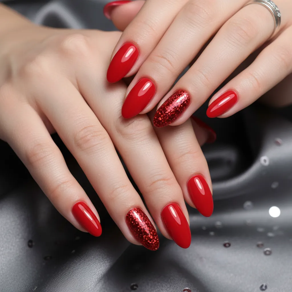 A full set of red glitter nails can be a lot, but an accent nail is the perfect compromise.