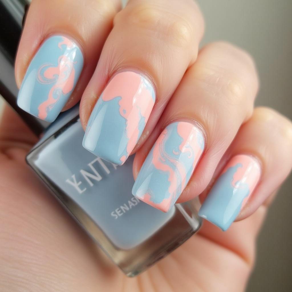 Create a beautiful pastel marble design using baby blue and peach for a gentle, harmonious springtime look.