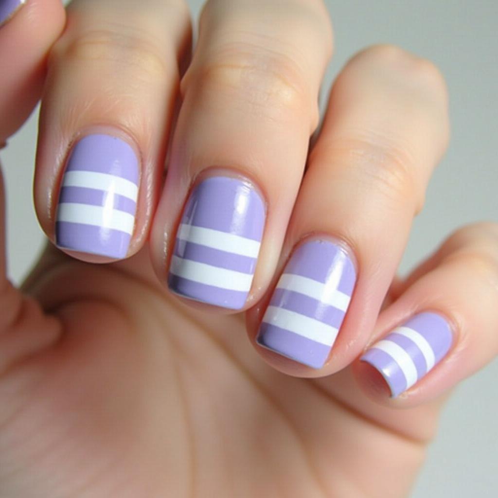 Add a minimalist touch to lavender nails by incorporating thin white stripes for a simple yet stylish design.