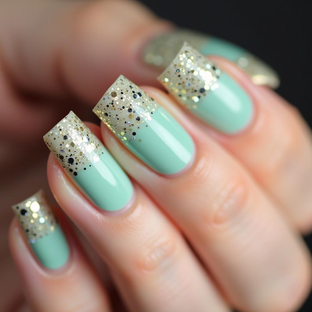 Start with a mint green base and blend in gold glitter at the tips for a trendy yet sophisticated manicure.
