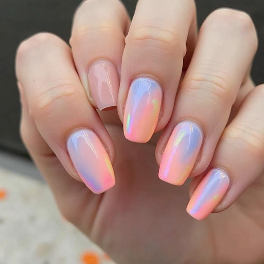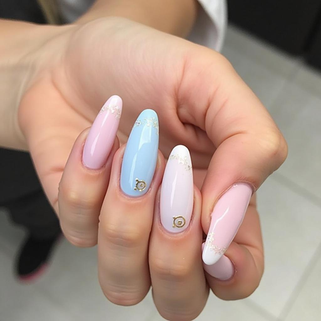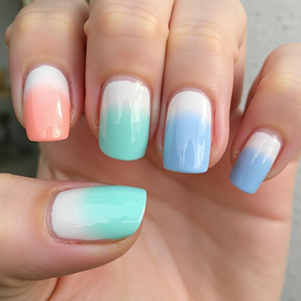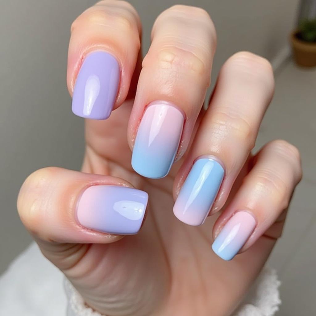 Create a gentle ombre effect by blending soft pink, lavender, and baby blue on each nail for a fresh, springtime gradient.
