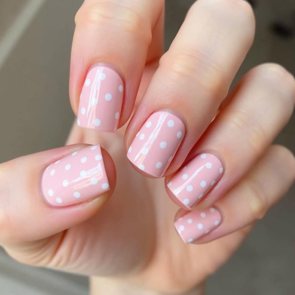 Add a touch of fun with small white dots scattered across your pale pink nails for a playful yet polished design.