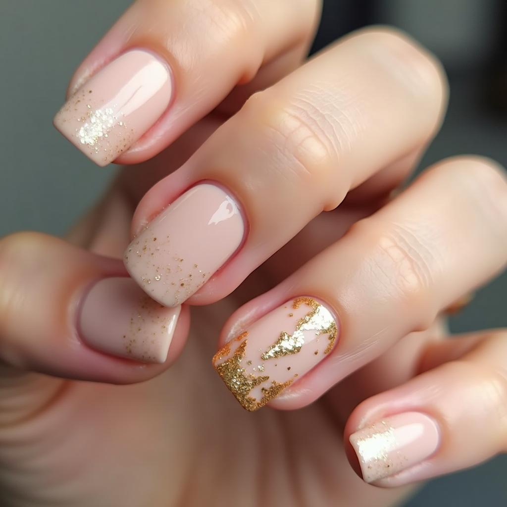 Add a hint of glamour by placing delicate gold foil accents on your peachy nude nails for a luxe finish.