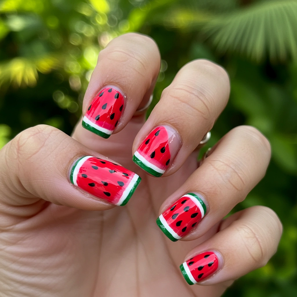 Paint a single watermelon slice on an accent nail with a bright red base, green rind, and black seeds for a juicy, fresh look.