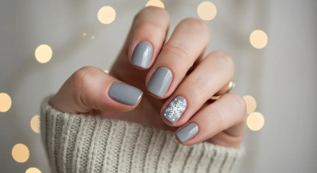 Paint most of your nails a solid, chic winter color like a deep burgundy or a soft greige and dedicate just your ring finger to a single, beautifully drawn snowflake.