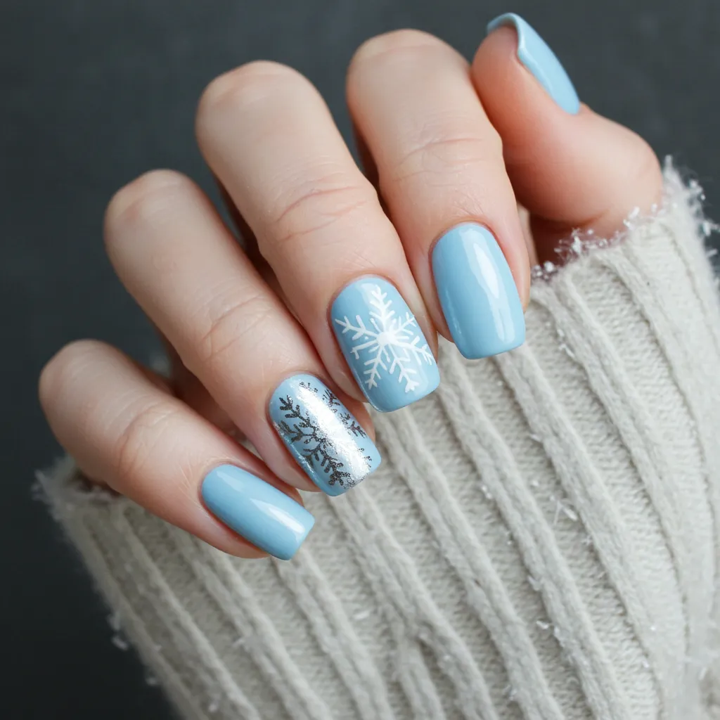 A soft baby blue base with delicate snowflakes painted in a metallic silver polish is an absolutely dreamy combination.