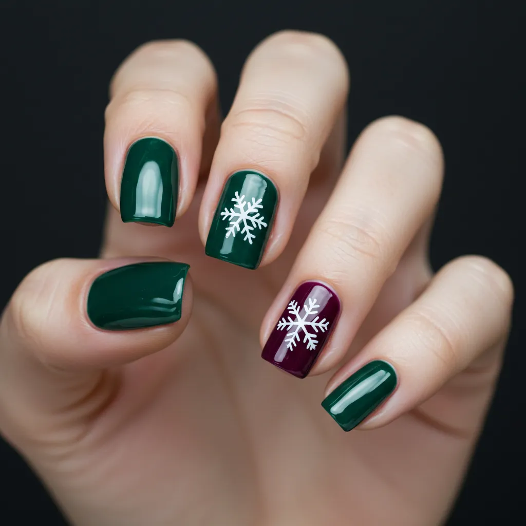 A deep, jewel-toned base like emerald green, rich plum, or crimson red with a single white or silver snowflake creates a stunning, dramatic contrast.