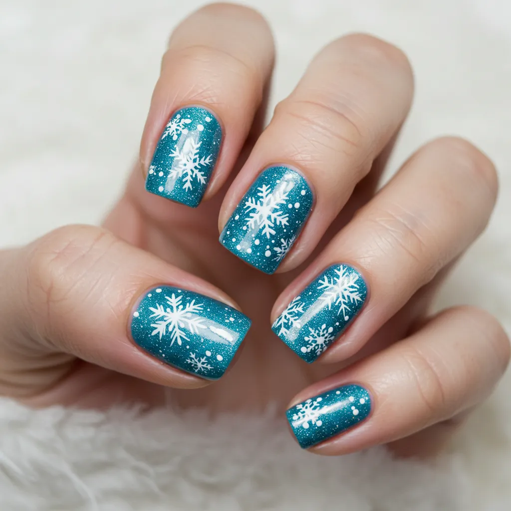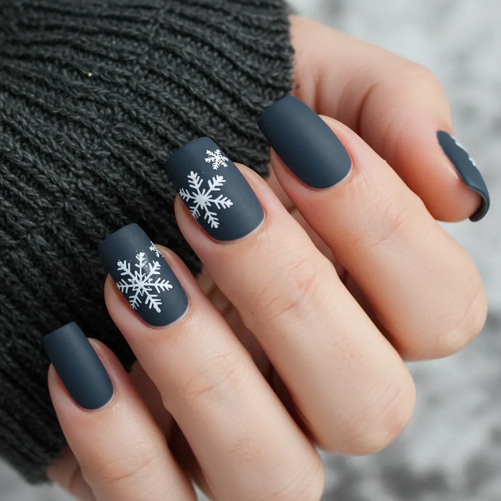 A deep navy, forest green, or even black base with matte white snowflakes creates a velvety, sophisticated finish.