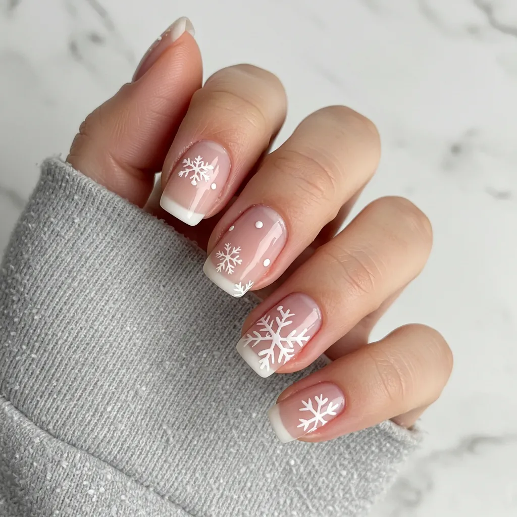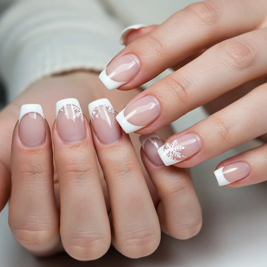 Keep the base sheer or nude, and replace the traditional white tip with a delicate snowflake design that curves along the edge of your nail.