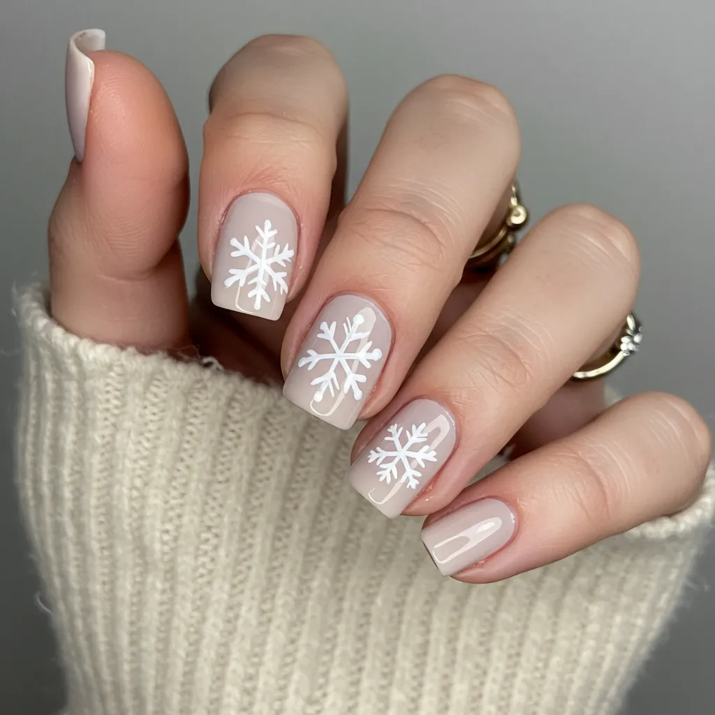 Use a clear or sheer nude base coat, and draw your white snowflakes directly onto the nail.