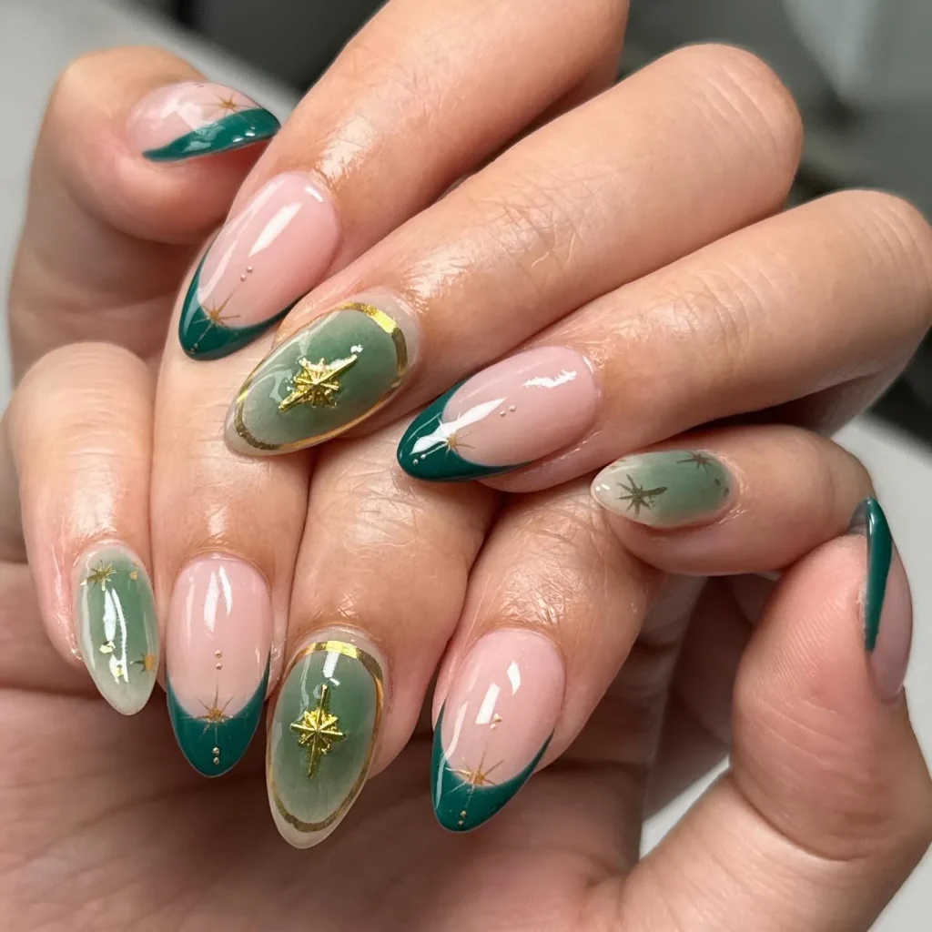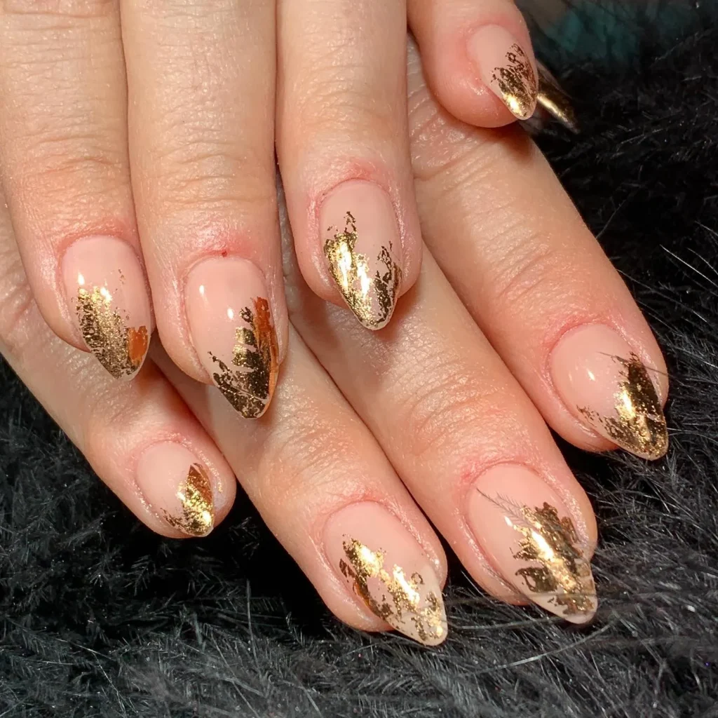 Keep your French tips classic or with a cranberry twist, but on one or two nails, add a delicate gold or copper leaf design over the tip.